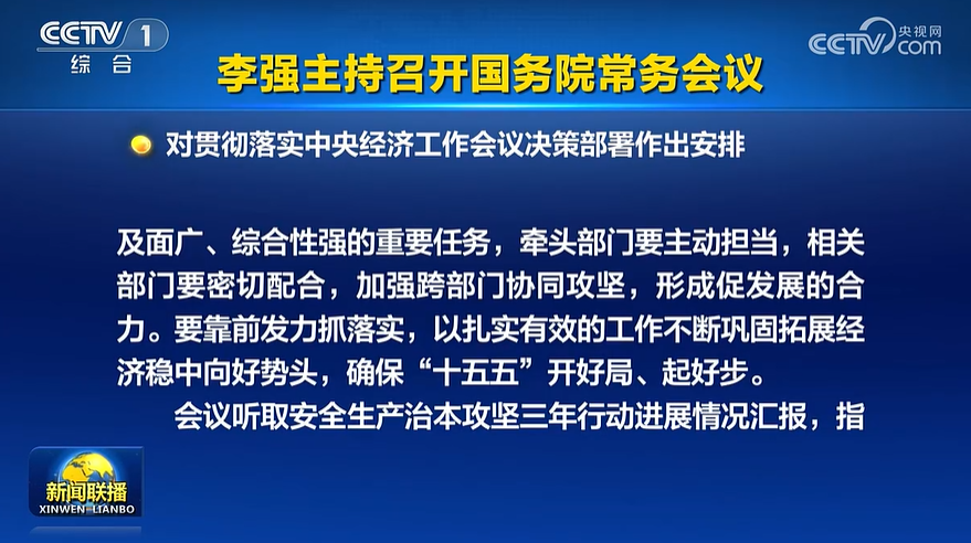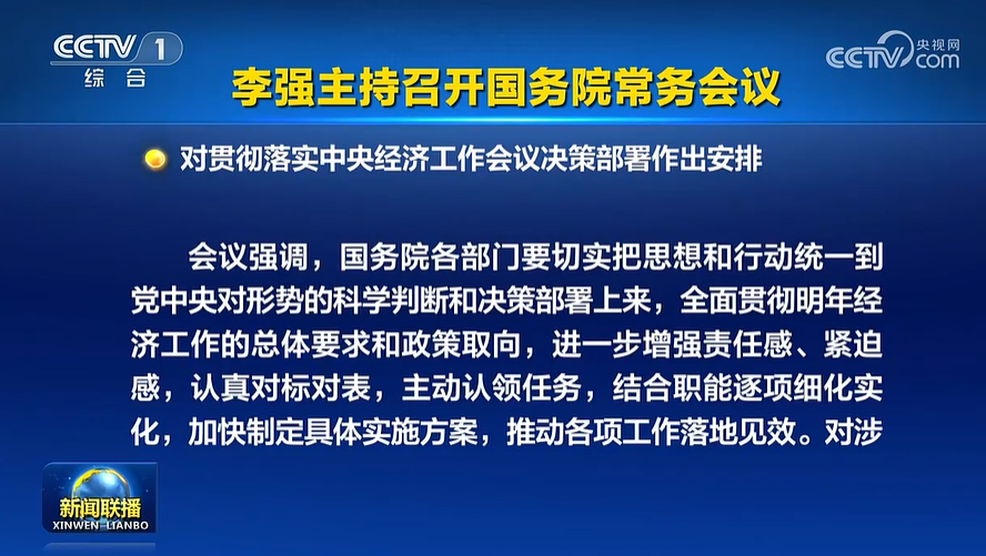 財聯(lián)社12月19日電,據(jù)央視新聞,國務(wù)院總理李強12月19日主持召開國務(wù)院常務(wù)會議,深入學習貫徹習近平總書記在中央經(jīng)濟工作會議上的重要講話精神,對貫徹落實中央經(jīng)濟工作會議決策部署作出安排。會議強調(diào),國務(wù)院各部門要切實把思想和行動統(tǒng)一到黨中央對形勢的科學判斷和決策部署上來,全面貫徹明年經(jīng)濟工作的總體要求和政策取向,進一步增強責任感、緊迫感,認真對標對表,主動認領(lǐng)任務(wù),結(jié)合職能逐項細化實化,加快制定具體實施方案,推動各項工作落地見效。對涉及面廣、綜合性強的重要任務(wù),牽頭部門要主動擔當,相關(guān)部門要密切配合,加強跨部門協(xié)同攻堅,形成促發(fā)展的合力。要靠前發(fā)力抓落實,以扎實有效的工作不斷鞏固拓展經(jīng)濟穩(wěn)中向好勢頭,確?!笆逦濉遍_好局、起好步。