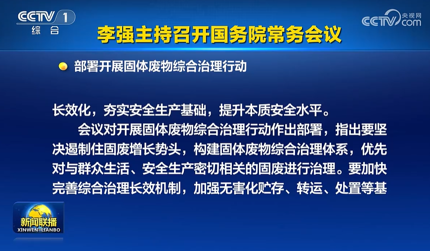 財(cái)聯(lián)社12月19日電,據(jù)央視新聞,李強(qiáng)主持召開國務(wù)院常務(wù)會議,會議對開展固體廢物綜合治理行動作出部署,指出要堅(jiān)決遏制住固廢增長勢頭,構(gòu)建固體廢物綜合治理體系,優(yōu)先對與群眾生活、安全生產(chǎn)密切相關(guān)的固廢進(jìn)行治理。要加快完善綜合治理長效機(jī)制,加強(qiáng)無害化貯存、轉(zhuǎn)運(yùn)、處置等基礎(chǔ)設(shè)施建設(shè),提升固廢資源化利用水平,發(fā)揮市場力量促進(jìn)循環(huán)經(jīng)濟(jì)發(fā)展。