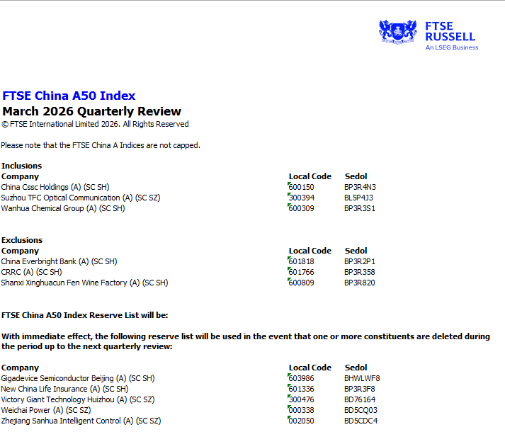 財聯(lián)社3月4日電,富時羅素3月4日宣布對富時中國指數(shù)系列進行修訂調整,調整將于2026年3月20日(星期五)收盤后生效。其中富時中國A50指數(shù)納入中國船舶、天孚通信、萬華化學,剔除光大銀行、中國中車、山西汾酒。